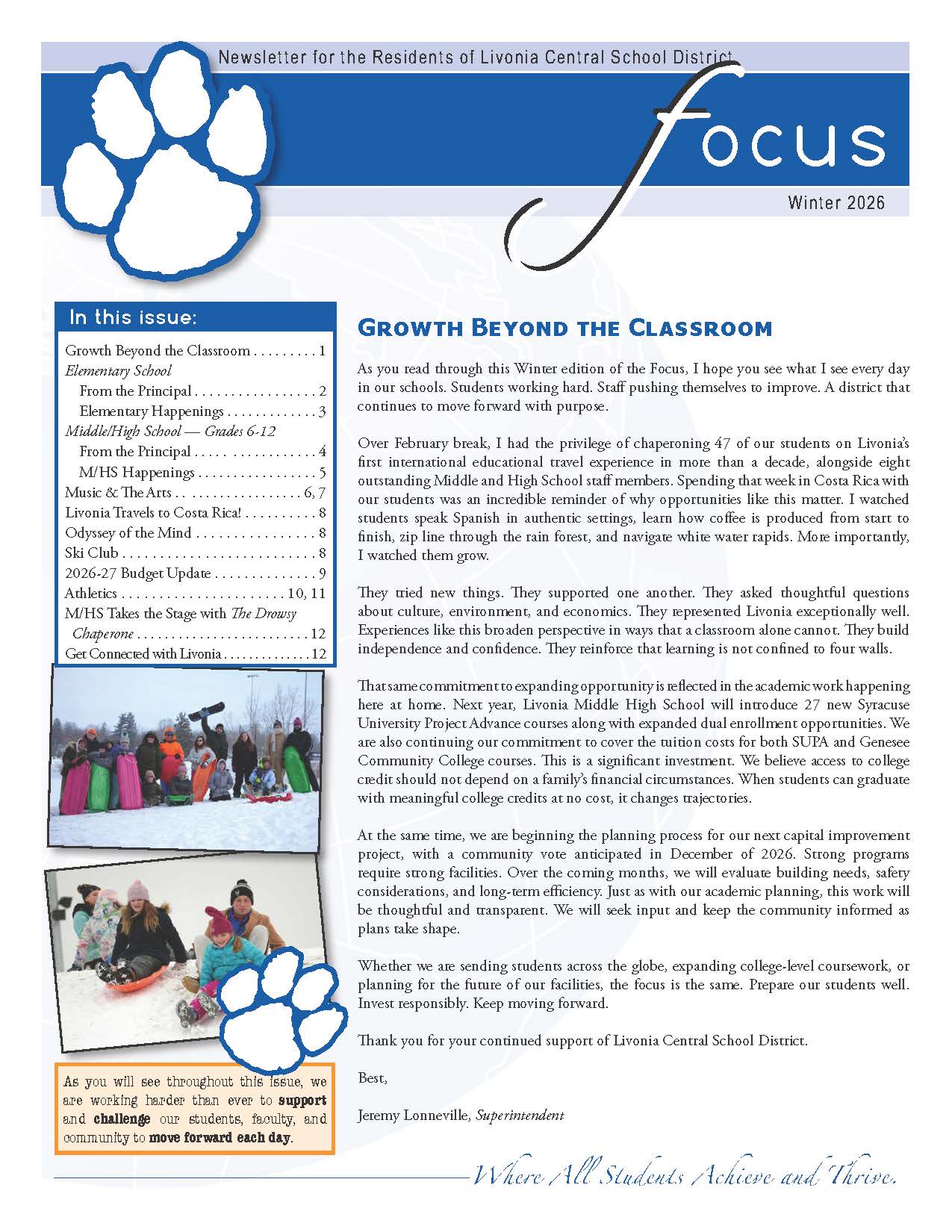 That same commitment to expanding opportunity is reflected in the academic work happening here at home. Next year, Livonia Middle High School will introduce 27 new Syracuse University Project Advance courses along with expanded dual enrollment opportunities. We are also continuing our commitment to cover the tuition costs for both SUPA and Genesee Community College courses. This is a significant investment. We believe access to college credit should not depend on a family’s financial circumstances. When students can graduate with meaningful college credits at no cost, it changes trajectories.